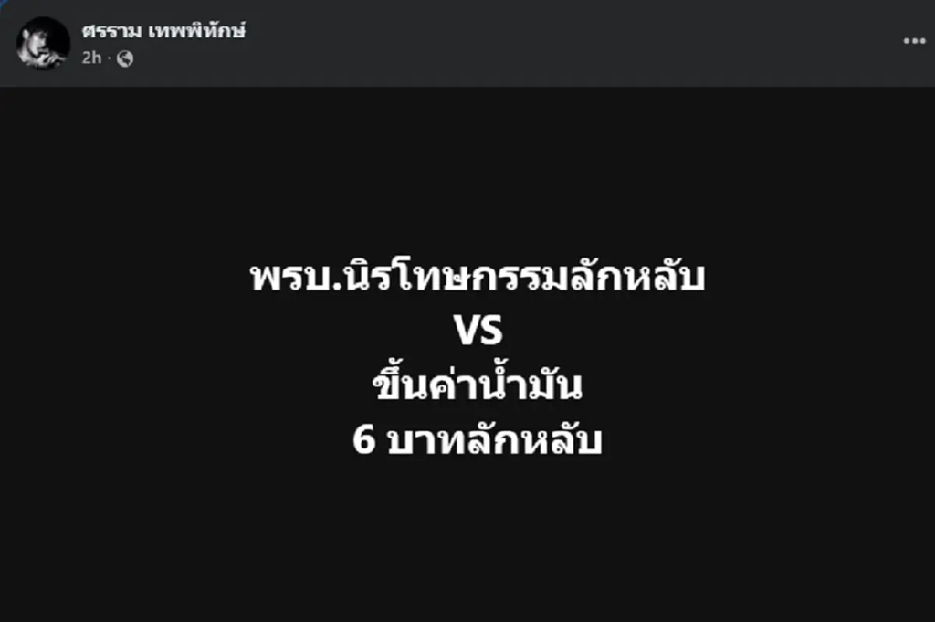 หนุ่ม ศรราม งานนี้ขอเป็นกระบอกเสียงให้ประชาชน หลัง ราคาน้ำมันปรับขึ้น 6 บาท โดยได้โพสต์ผ่านเฟซบุ๊ก ศรราม เทพพิทักษ์ ระบุว่า
